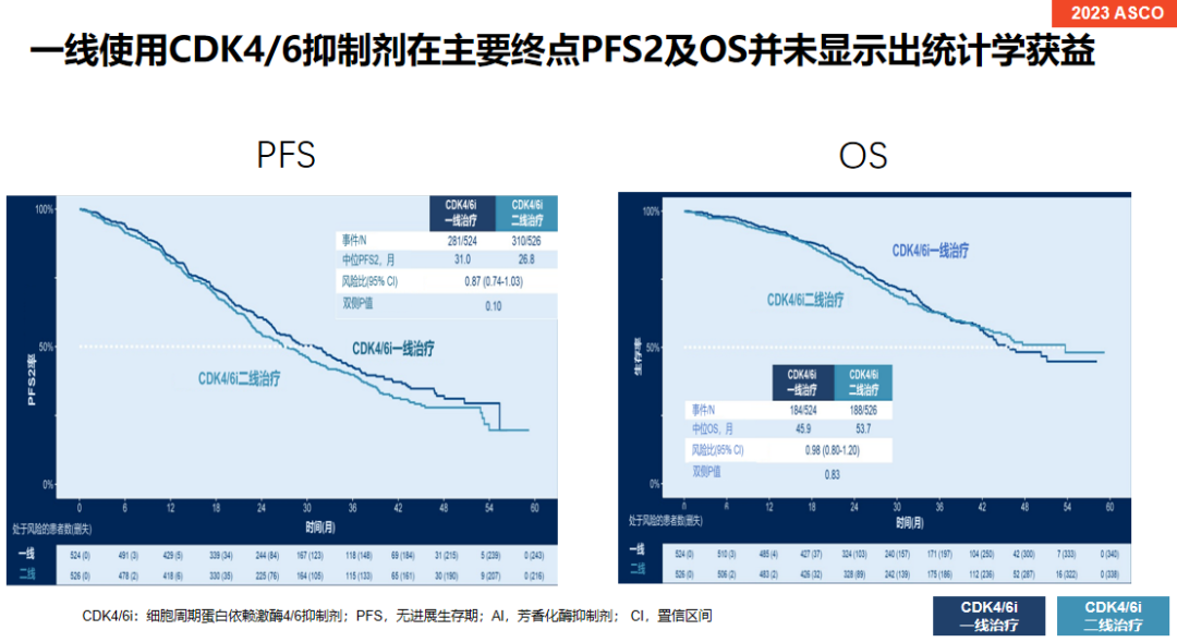 在SONIA临床研究当中超过90%的患者接受的是哌柏西利治疗,得到的一线CDK4/6抑制剂治疗获得的OS时间是45.9个月,虽然时长并不算长,但并不是每种CDK4/6抑制得到的OS结果都这样的。MONALEESA-2临床研究当中得到的OS为63.9个月,而monarchE中患者的OS也超过了5年,因此,我们知道每种CDK4/6抑制剂所带来的OS时间也是不一样的,CDK4/6抑制剂种类不同患者生存也会存在偏差。