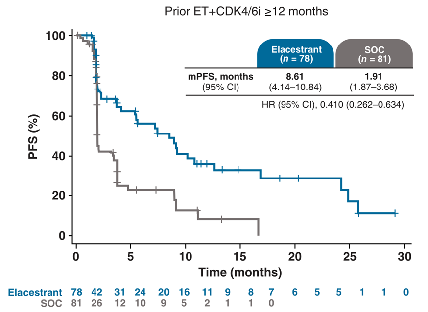 在真正的二线治疗中,对于ESR1突变的患者,我们可以选择口服SERD类的药物。EMERALD研究共入组478例患者(Elacestrant组,239例;SOC组,239例)。其中222例患者(Elacestrant组,112例;SOC组,110例)伴有ESR1突变且晚期或转移环境中接受了ET+CDK4/6i治疗。研究结果提示,在这部分既往ET+CDK4/6i治疗≥12个月的患者中,Elacestrant组mPFS为8.6个月,而SOC组mPFS为1.9个月(HR=0.41;95%CI:0.26~0.63,P<0.014)。