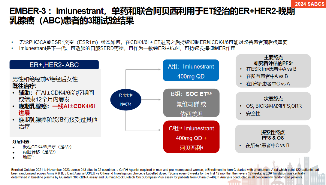 此外,2024年SABCS大会上公布的EMBER-3临床研究结果也证实了ESR1突变的患者,应用口服SERD药物(Imlunestrant)也能取得较好的治疗效果。Imlunestrant+阿贝西利甚至能达到11.1个月的PFS。由此可见,对于ESR1突变的患者,口服SERD±CDK4/6抑制剂都是较好的治疗选择。