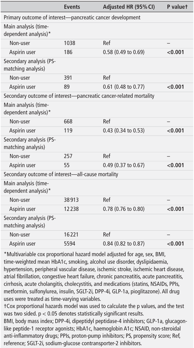 参考文献:Tan JT,Mao X,Cheng HM,Seto WK,Leung WK,Cheung KS.Aspirin is associated with lower risk of pancreatic cancer and cancer-related mortality in patients with diabetes mellitus.Gut.Published online January 2,2025.doi:10.1136/gutjnl-2024-333329