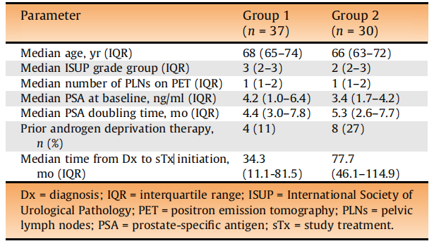 在2014年8月至2016年7月期间,共入组了15个研究中心的67名患者。根据既往治疗的生化复发情况,患者被分为两组:第1组包括37名在初次治疗(根治性前列腺切除或放射治疗)后首次出现生化复发的患者;第2组包括30名接受前列腺床放射治疗后出现二次生化复发的患者。所有患者均接受了挽救性放射治疗联合6个月ADT治疗。