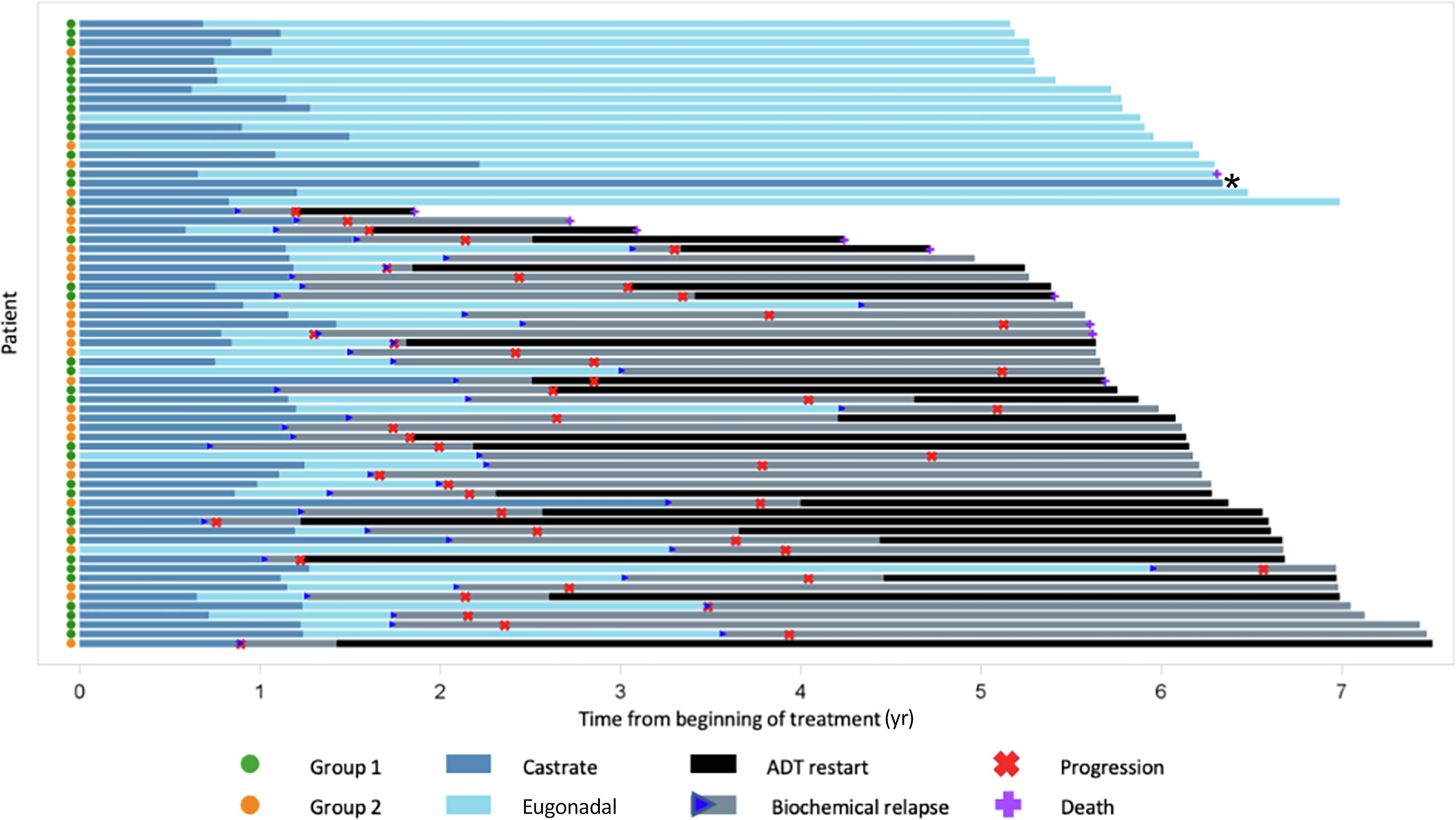 中位随访时间为6.1年。5年的中位无进展生存期(PFS)为3.8年,5年PFS率为39%。5年的中位无生化复发生存期(BRFS)为2.2年,5年BRFS率为31%。5年的无二线治疗生存(STFS)率为43%;5年的无ADT重启生存(ARFS)率为64%。5年的无事件生存(EFS)率为49%,中位EFS为4.5年;5年的无转移生存(MFS)率为59%,中位MFS为6.6年。所有患者5年总生存率为92%。