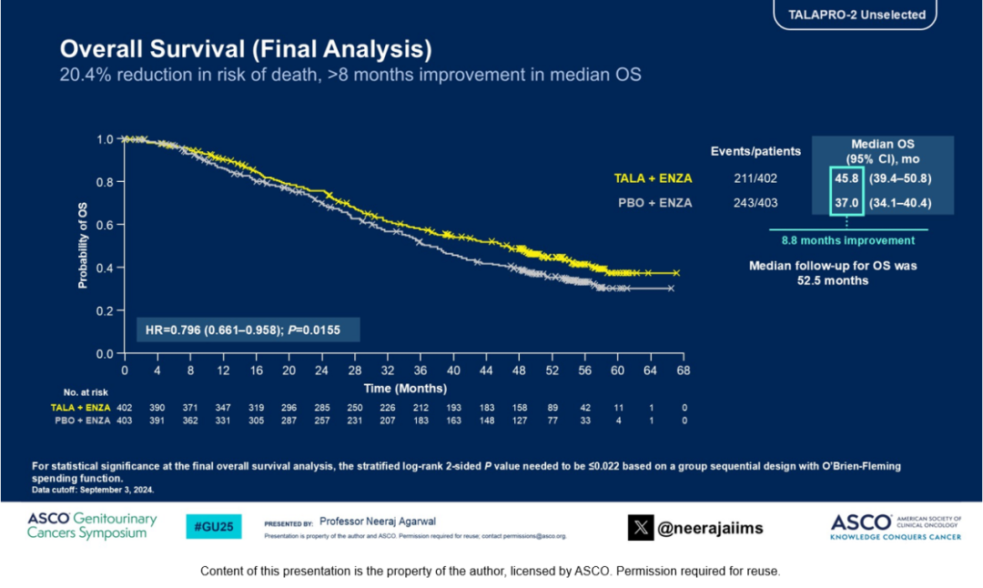 2025年ASCO GU大会上,TALAPRO-2研究重磅发布:他拉唑帕利联合恩扎卢胺较安慰剂联合恩扎卢胺一线治疗未筛选的转移性去势抵抗性前列腺癌(mCRPC)的OS数据取得阳性结果中位OS分别为45.8 vs 37.0个月,HR 0.796(95%CI:0.661-0.958)[1],引发全球范围的高度关注。此次研究在全人群(all-comers)中实现了显著的生存获益,为mCRPC一线治疗策略的革新提供了新思路。