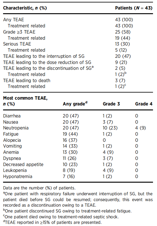 5、SG安全性良好:中性粒细胞减少症、腹泻最常见,未见新的安全性信号,停药率低至2%,总体易管理。
