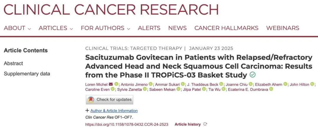 近日,纪念斯隆-凯特琳癌症中心Loren Michel教授领导的研究团队,在权威期刊《Clinical Cancer Research》上发表了TROPiCS-03试验的最新成果,揭示了SG对HNSCC患者的抗肿瘤活性及安全性[2]
