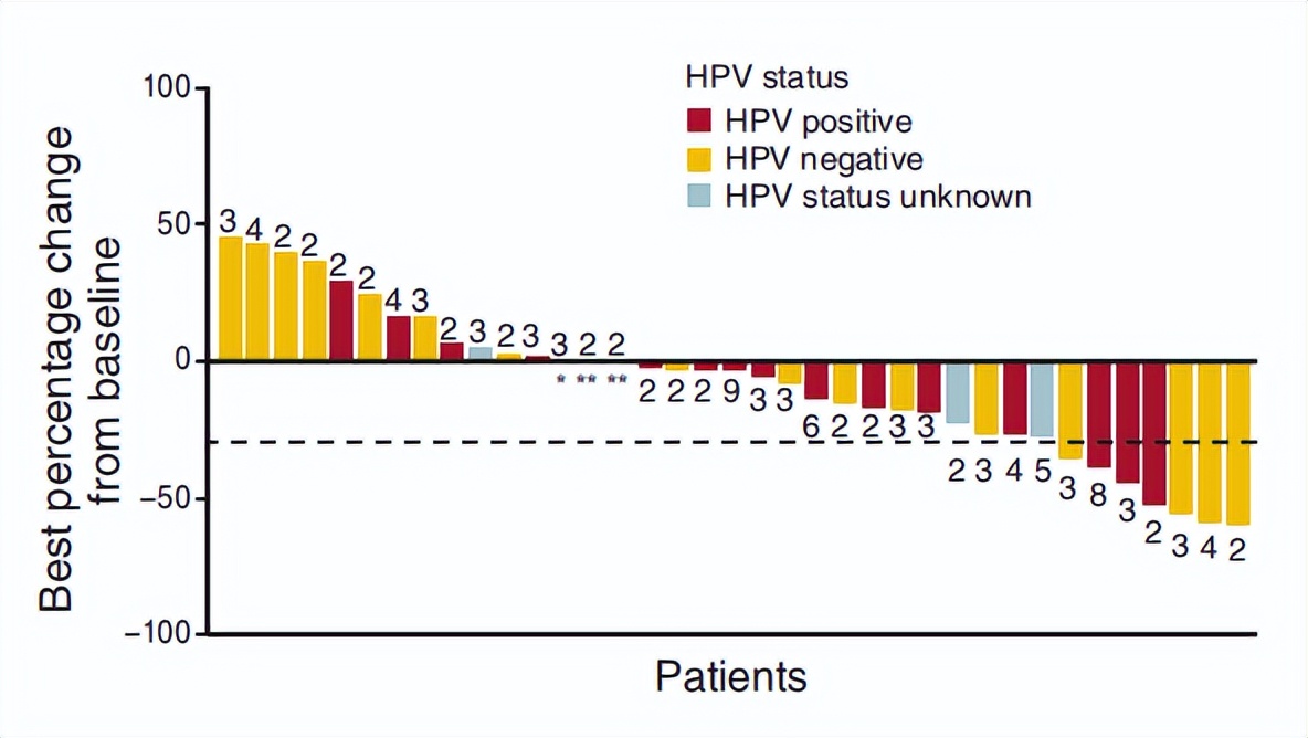 在入组的43名患者中,有22名(51%)患者肿瘤体积缩小,其中7名(16%)患者缩小超过30%,达到了部分缓解(PR)。在这7名PR的患者中,有一名接受过4线治疗,还有一名接受过8线治疗。在21名病情稳定(SD)的患者中,有3名患者分别接受过5、6和9线治疗。无论是HPV阳性还是阴性患者,均能观察到患者病情缓解。