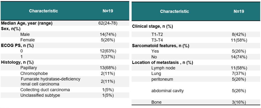 疗效方面,中位随访8.9个月时,中位无进展生存期(PFS)尚未达到,6个月PFS率为79.8%。在19例可评估的患者中,10例达到部分缓解,7例疾病稳定,客观缓解率(ORR)为52.6%(95%CI:30.2%-75.1%),疾病控制率(DCR)为89.5%(95%CI:66.9%-98.7%)。最终有3例患者出现快速进展,这些患者均具有肉瘤样特征(其中2例为乳头状肾细胞癌,1例为嫌色细胞癌)。