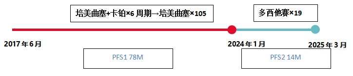 患者进入到二线治疗,该患者再次符合我科“优替德隆对照多西他赛治疗含铂化疗失败的局部晚期或转移性非小细胞肺癌的III期、开放、随机对照临床试验”经随机进入多西他赛组,截止至目前患者已行多西他赛治疗19周期,期间评效为SD(图3),二线无进展生存至今为14个月,患者总生存期截止目前超过92个月(整体治疗过程如图4所示)。