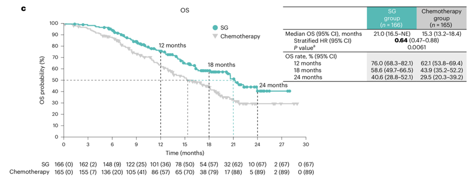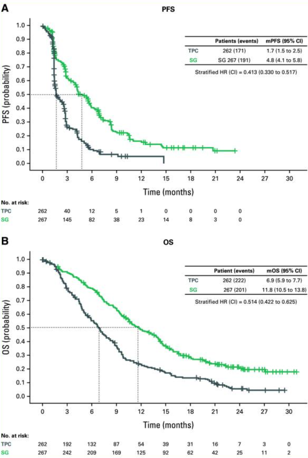 在安全性方面,SG无间质性肺病(ILD)、心脏毒性、眼毒性等特殊安全信号,主要的不良反应是血液学毒性,可以通过相关生长因子予以支持治疗,从而保障了患者的生活质量。在SG相关研究的患者报告的结局(PRO)显示,SG可较TPC带来整体生存状况/生活质量(GHS/QoL)、生理机能(PF)、虚弱、疼痛等方面的显著改善,展示了其独特的疗效特点[3]