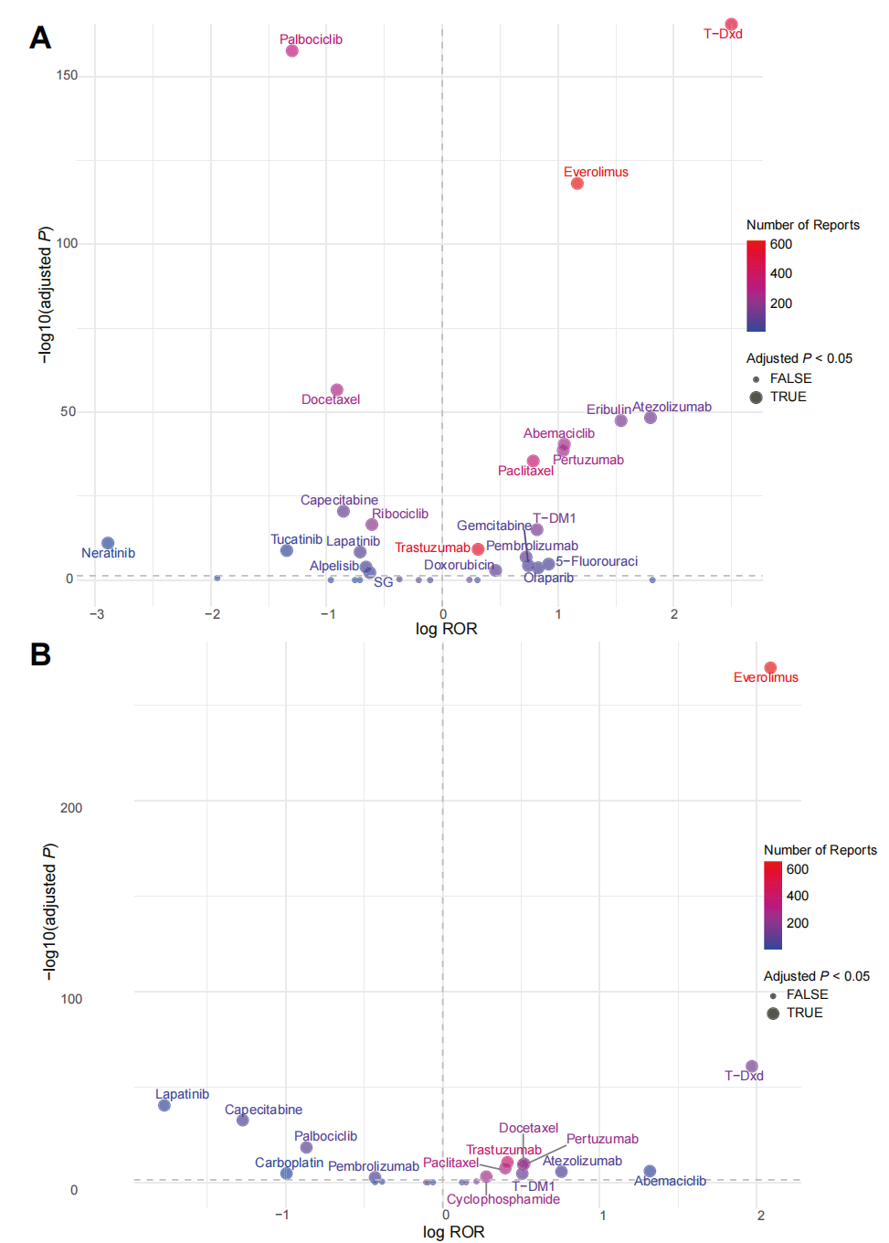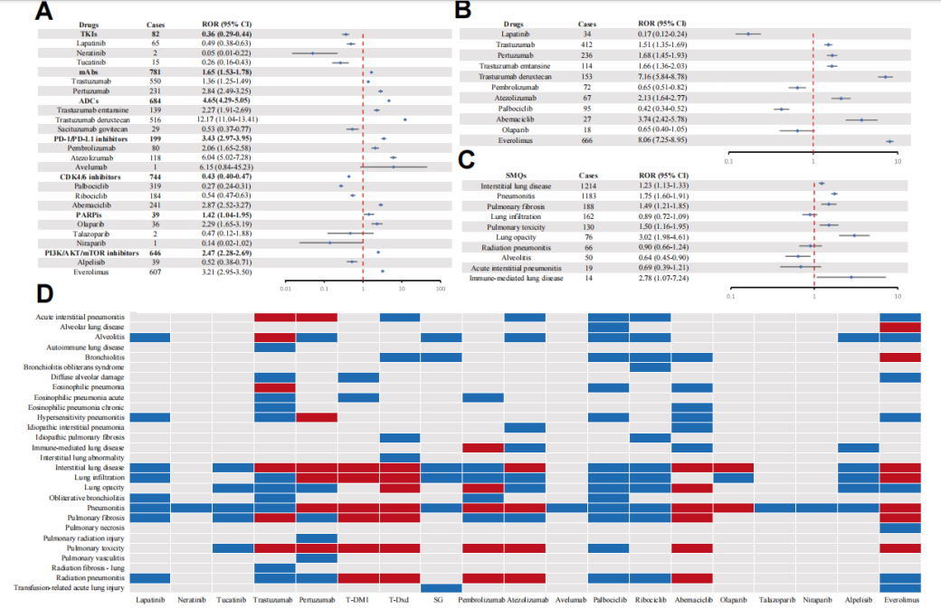 结果显示,通过分析来自FAERS数据库的2913例和JADER数据库的1868例ILD患者后,识别出包括T-DXd、T-DM1、曲妥珠单抗、帕妥珠单抗、阿贝西利、阿替利珠单抗和依维莫司在内的多种新型抗肿瘤药物与ILD的发生密切相关。