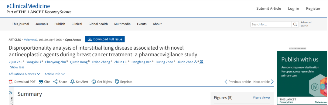 △eClinicalMedicine官网发表《Disproportionality analysis of interstitial lung disease associated with novel antineoplastic agents during breast cancer treatment:a pharmacovigilance study》