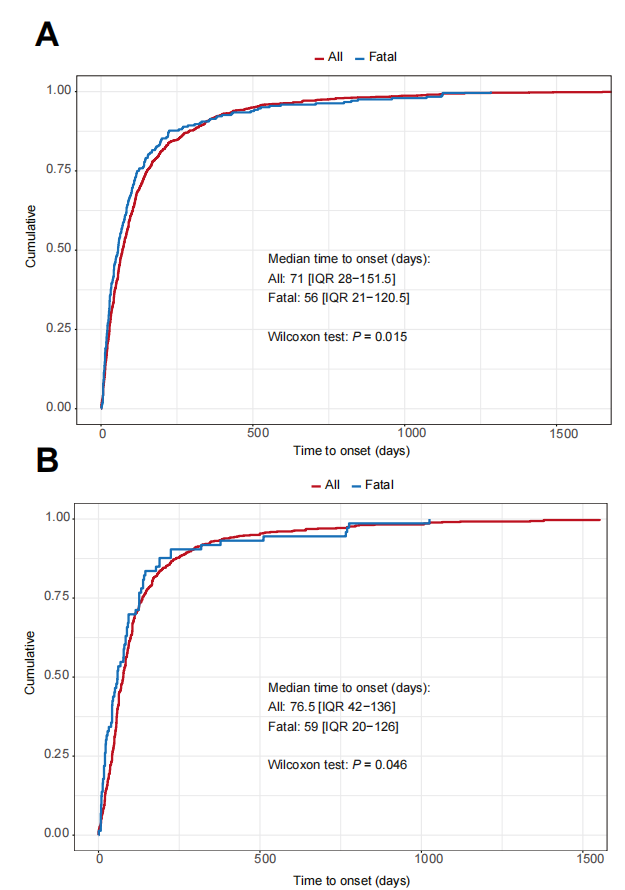 △FAERS(A)和JADER(B)数据库中显示所有病例和死亡病例接受新型抗肿瘤药物治疗后至ILD发病时间的累积分布曲线