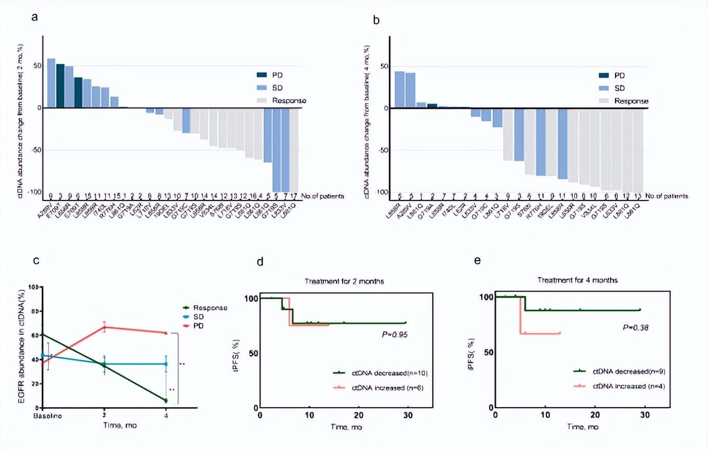 在21例非经典突变的NSLSC-LM患者的CSF中均检测到了基线EGFR突变ctDNA。经过2个月和4个月的伏美替尼治疗后,分别有17例(90.0%)和13例(61.9%)患者仍可检测到EGFR突变ctDNA。在ctDNA丰度降低的患者中,缓解(Response)和疾病稳定(SD)患者均观察到颅内反应,而ctDNA丰度增加的患者则与SD和疾病进展(PD)相关。治疗2个月和4个月后,分别有3例和2例患者实现了ctDNA清除。ctDNA动态分析表明,颅内反应与ctDNA丰度变化程度相关(缓解组vs.SD组,P=0.007;缓解组vs.PD组,P=0.004)。EGFR丰度降低的患者表现出更高的颅内无进展生存期(iPFS),但由于样本量较小,未达到统计学显著性差异(图4)。