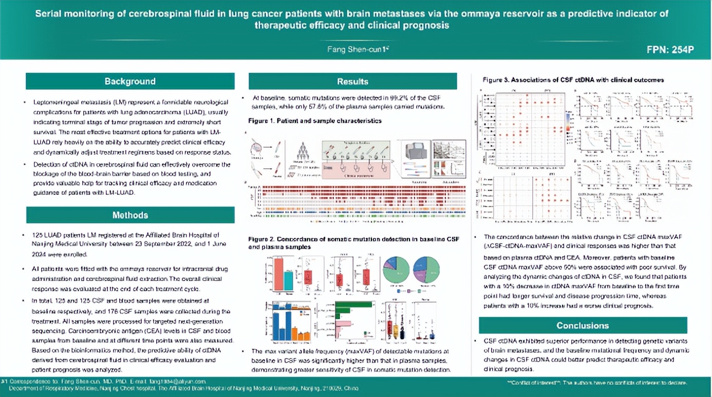 在晚期非小细胞肺癌(NSCLC)诊疗领域,中枢神经系统(CNS)转移被称为“最后的战场”——诊断滞后、耐药频发、缺乏动态监测手段,患者中位生存期不足6个月。如何破解这一困局?南京医科大学附属脑科医院方申存教授带领多学科团队,以脑脊液ctDNA为“分子雷达”,首次实现颅内肿瘤的实时追踪与疗效预判,相关2项成果亮相2025 ELCC,这不仅填补了肺癌脑转移动态监测的空白,更以“中国原创”引领全球精准医疗浪潮。从实验室到临床,从南京到巴黎,这项研究诠释了“科研为民”的初心,也为无数患者点燃了生命新希望!