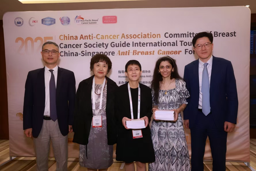 2025年吴炅教授(右一)、张瑾教授(左二)于新加坡向亚太乳腺癌峰会主席赠送“CBCS小红书”