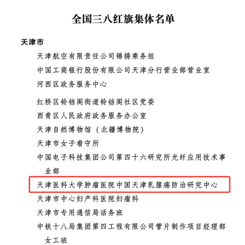 天津医科大学肿瘤医院中国天津乳腺癌防治研究中心荣获2024年度“全国三八红旗集体”荣誉称号