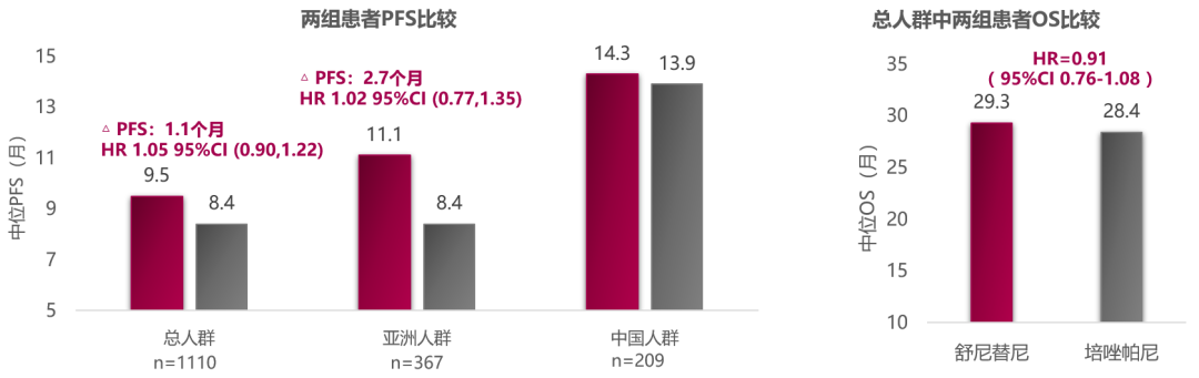 其中,COMPARZ研究是一项头对头、随机、开放标签、III期、非劣效性研究,共纳入1110例晚期肾透明细胞癌患者,旨在评价舒尼替尼和培唑帕尼一线治疗晚期肾透明细胞癌的疗效和安全性。研究结果表明,无论是总人群、亚洲人群还是中国人群,舒尼替尼对比培唑帕尼用于mRCC一线治疗,PFS/OS数值上均更优[4-6]。