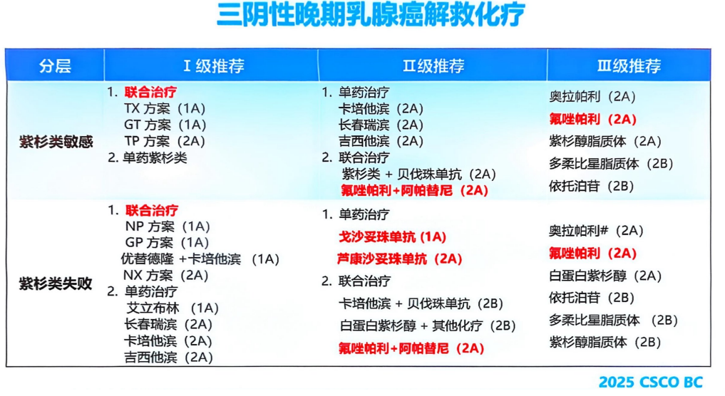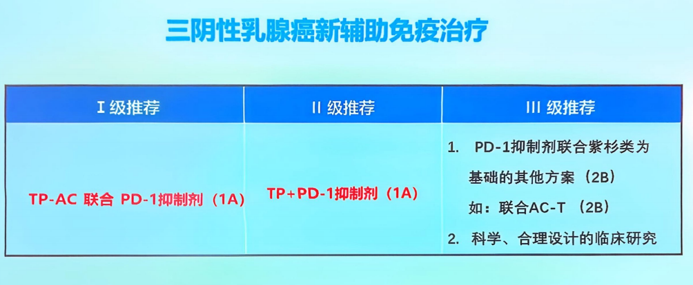 在三阴性乳腺癌治疗领域,新辅助治疗领域免疫治疗的地位不断提升。今年指南对三阴性免疫治疗的推荐进行了更详细的调整。同时,随着一些新产品如PARP抑制剂、ADC等药物的获批上市,也推动了指南解救化疗部分的更新。