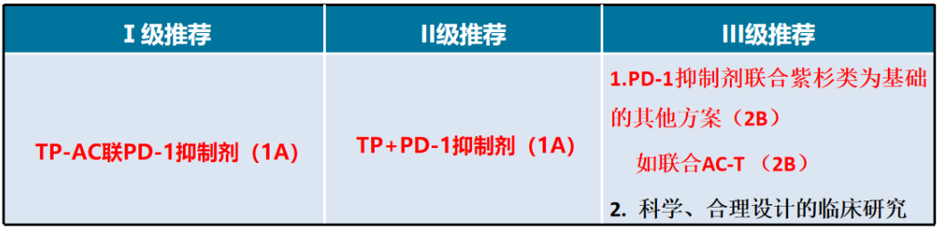 3、基于现有的临床研究及专家共识推荐:III级推荐新增PD-1抑制剂联合紫杉类为基础的其他方案