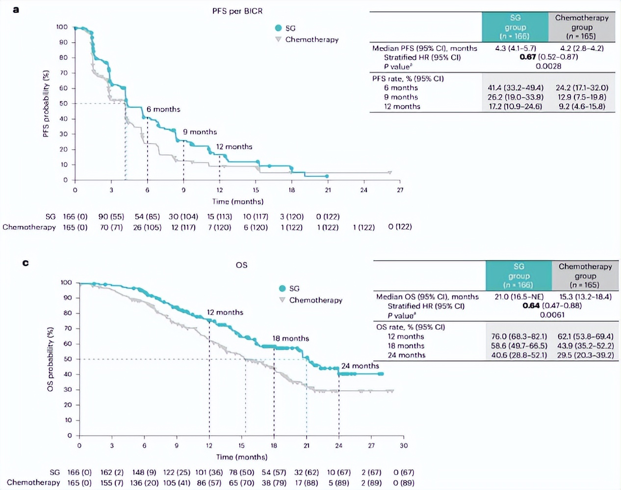在此基础上,针对亚裔人群的EVER-132-002研究正式开展,其中70%的患者来自中国大陆,并取得了与国际TROPiCS-02研究类似的结果,改善了mPFS,6个月、9个月和12个月PFS率均显著提升近2倍;mOS(21.0个月vs 15.3个月;HR 0.64;95%CI:0.47-0.88;P=0.0061)也得到了延长(图2)[4]。