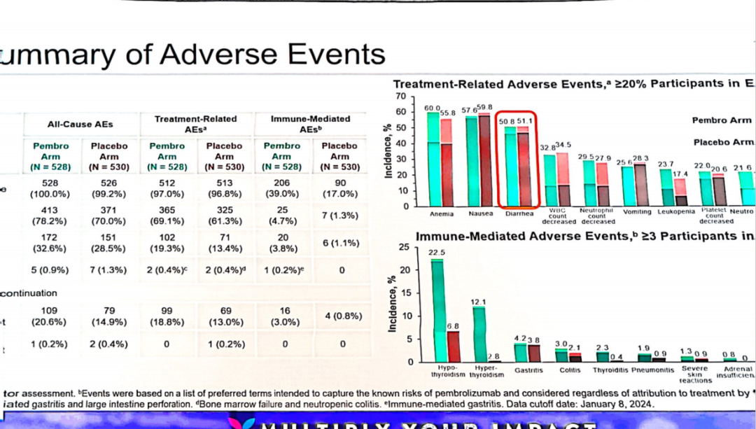在安全性层面,帕博利珠单抗联合CCRT组安全性与已知的个体治疗方案一致,未发现新的安全信号。≥3级治疗相关不良事件发生率分别为69.1%和61.3%。