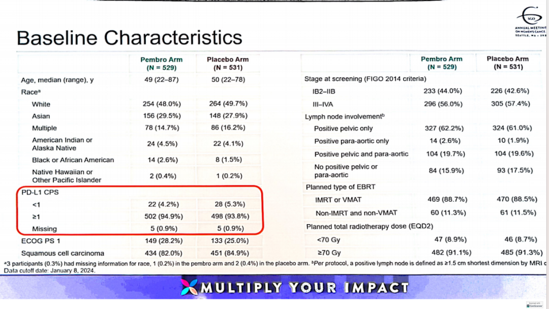 基线特征:共1060例患者随机分组(帕博利珠单抗+CCRT组529例,安慰剂+CCRT组531例)。表1为两组基线特征,包括年龄、种族、ECOG体能状态评分、肿瘤分期、淋巴结受累情况、PD-L1联合阳性评分(CPS)、计划EBRT类型、计划总放疗剂量、组织学类型等信息。