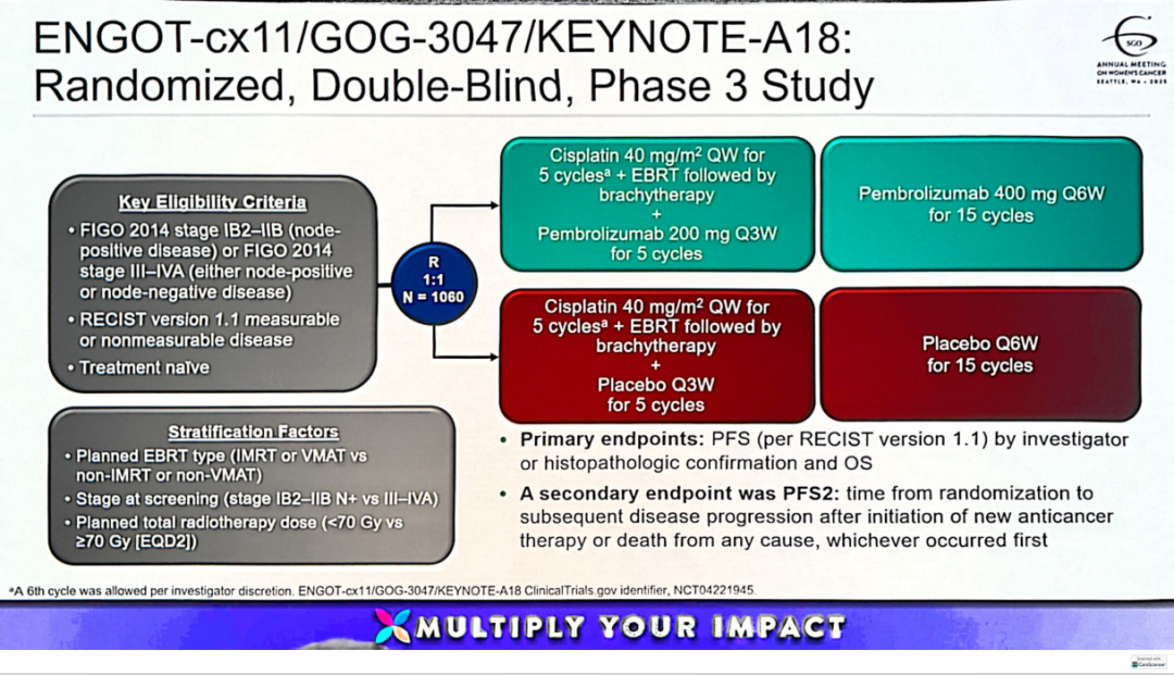 治疗方案:患者按1:1随机分配接受5个周期帕博利珠单抗200mg或安慰剂(Q3W)联合CCRT,后续15个周期帕博利珠单抗400mg或安慰剂(Q6W)治疗。CCRT方案包括顺铂40mg/m2(Q1W,5个周期)联合外照射放疗(EBRT)随后进行近距离放疗。