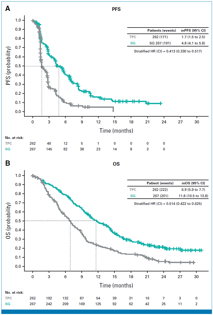 由此可见,在晚期TNBC临床研究的金标准OS方面,SG在国内外二线及以上治疗TNBC时均取得了1年左右的mOS,从而夯实了临床应用的地位。