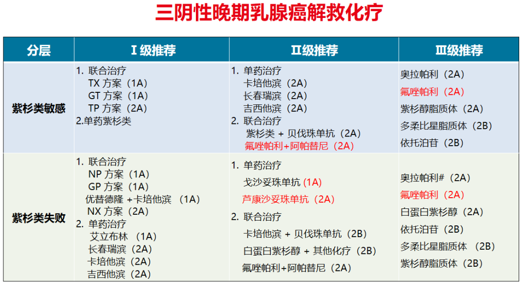 首先,三阴性晚期乳腺癌解救治疗仍然是分为两大板块进行治疗推荐的,第一部分是三阴性晚期乳腺癌解救化疗部分,第二部分是解救化疗联合免疫治疗部分。