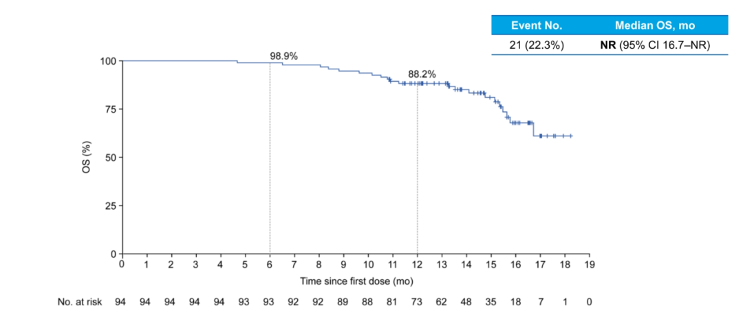 截至本次数据分析时,虽然中位随访时间已经达到14.2个月,但中位OS仍然尚不成熟,12个月的OS率达到了88.2%。