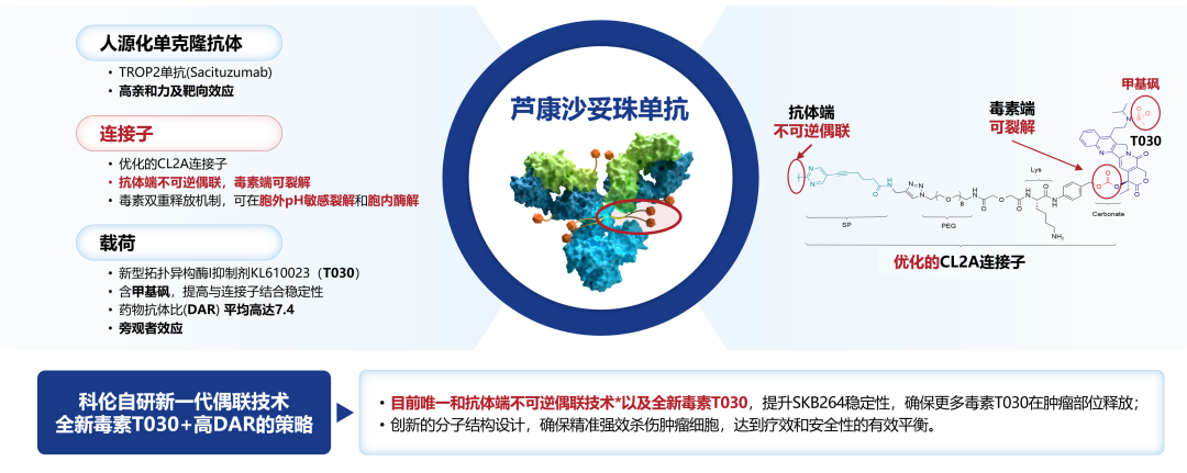 基于科伦自研新一代偶联技术,芦康沙妥珠单抗采用优化的CL2A连接子,能够与抗体端不可逆偶联,而与载荷端可裂解,从而提升其循环稳定性和减少脱靶效应;此外,连接子通过胞外pH敏感和胞内酶解的双重机制释放载荷毒素,从而增加载荷在肿瘤部位的释放。
