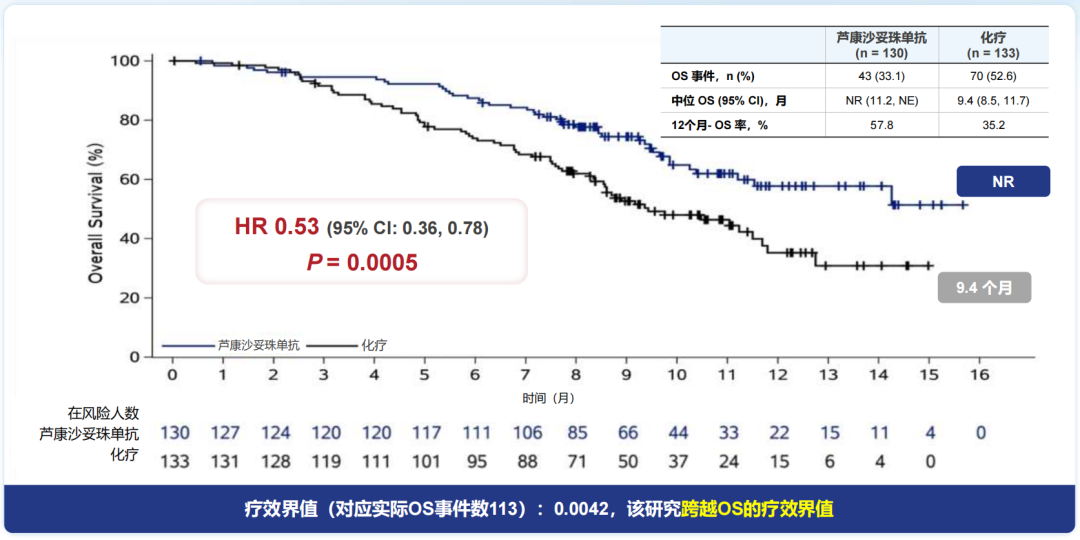 关键次要终点OS也显示获益,芦康沙妥珠单抗组和化疗组的中位OS分别为未达到(NR)和9.4个月,死亡风险显著降低47%(HR 0.53,95%CI:0.36-0.78,P=0.0005);而且所有亚组均展现出一致的OS获益趋势。此外,芦康沙妥珠单抗展现了高于化疗的强效肿瘤缓解效果,ORR是化疗的近4倍(45.4%vs 12.0%),中位持续缓解时间(DoR)是化疗的2倍多(7.1 vs 3.0个月)。