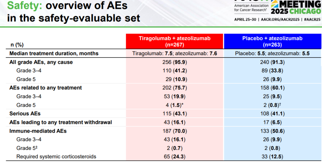 ◎在最终OS分析中(数据截至2024年9月),Tiragolumab+阿替利珠单抗组的中位OS为23.1个月,而安慰剂+阿替利珠单抗组为16.9个月(HR=0.87;95%CI:0.71-1.08;P=0.22);ORR分别为45.8%vs 35.1%,中位DOR分别为18.0个月vs 14.6个月。