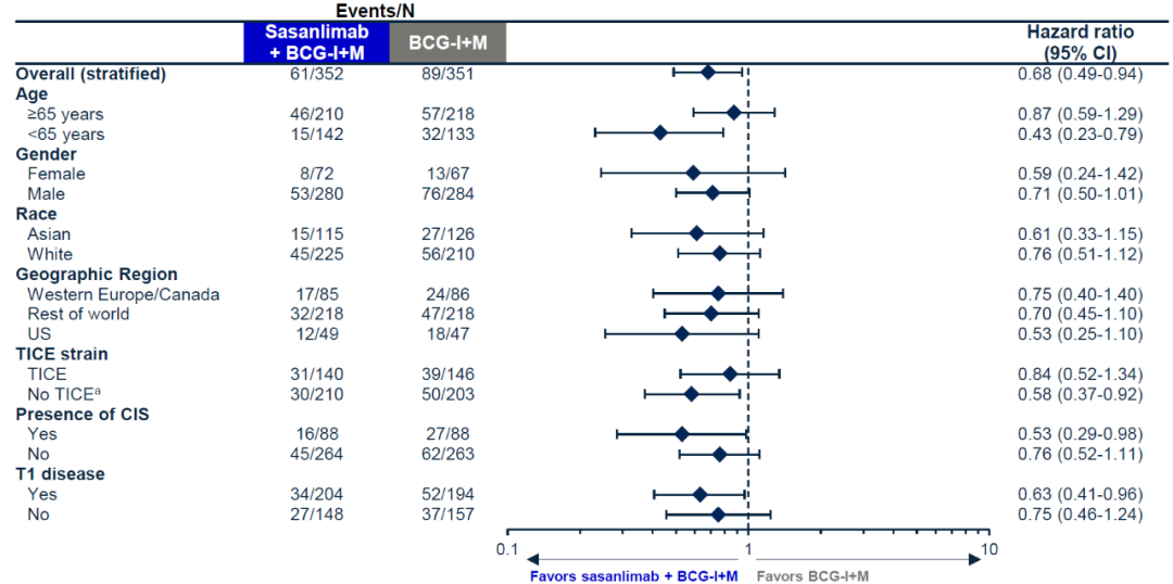 在疾病复发风险上,Sasanlimab联合BCG诱导+维持治疗同样可以显著降低高危NMIBC患者的术后高级别复发率,降幅超过50%。而在随后的亚组分析中同样显示,无论在哪个亚组,Sasanlimab联合BCG诱导+维持治疗均可以显著改善患者的EFS预后或有改善的趋势。