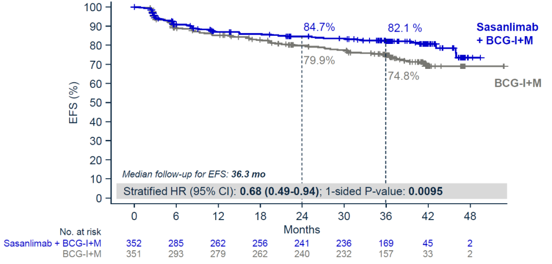在经过超过3年的随访时间后,研究结果显示,Sasanlimab联合BCG诱导+维持治疗,相较于单纯BCG诱导+维持治疗,可以显著改善高危NMIBC患者的EFS,尽管两组的mEFS均未达到,但联合组可以将患者疾病进展或死亡的风险降低32%,HR=68;在36个月时,Sasanlimab联合BCG诱导+维持组的EFS率达到82.1%,而单纯BCG组仅为74.8%。