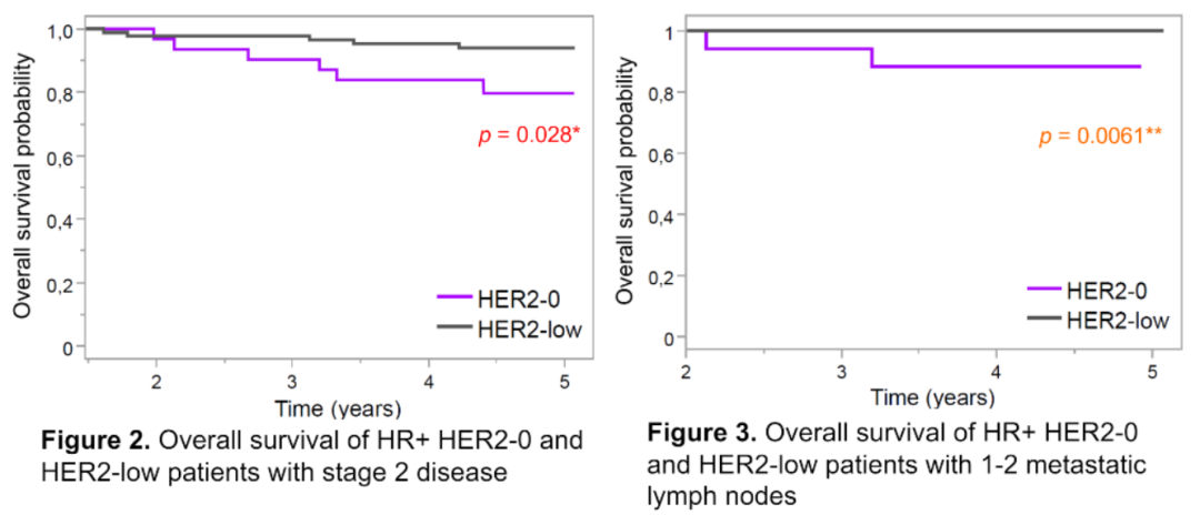 △2期疾病和1-2枚淋巴结转移患者中HER2 0表达和低表达的OS差异(图源:参考文献[6])