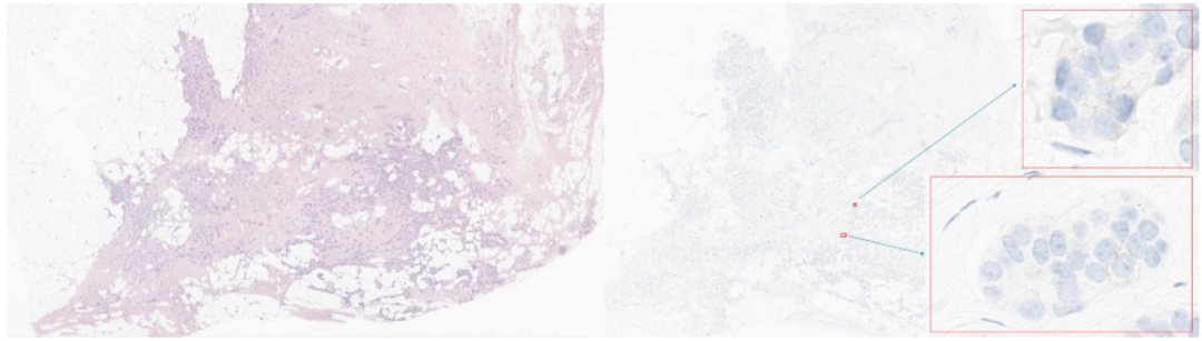 △韩国病理专家共识会议中的一个典型病例:原始诊断为HER2 0表达,重新诊断为HER2超低表达(图源:参考文献[3])