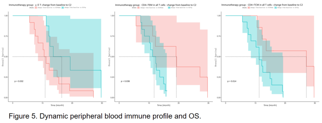 外周血动态监测显示,在免疫治疗组中,治疗后γδT细胞占比增加(PFS,P=0.035;OS,P=0.032)与较长的PFS和OS显著相关。治疗后CD4+TEM(PFS,P=0.021;OS,P=0.036)和CD4+TCM(PFS,P=0.01;OS,P=0.014)占比增加与较短的PFS和OS显著相关。