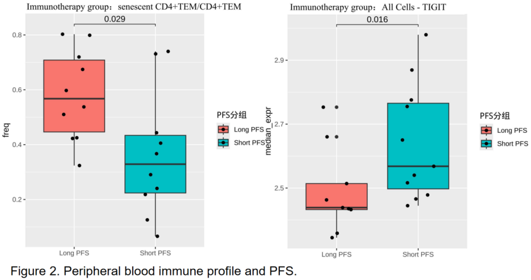 在免疫治疗组中,基线衰老CD4+TEM/CD4+TEM高占比(P=0.029)与较长的PFS显著相关。基线TIGIT高表达(P=0.016)与较短的PFS显著相关。