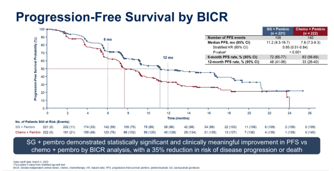 在分析的443名患者中,SG/pembro组的中位PFS为11.2个月,而化疗/pembro组为7.8个月,疾病进展或死亡风险降低了35%(HR 0.65,95%CI:0.51-0.84;P<0.001)。