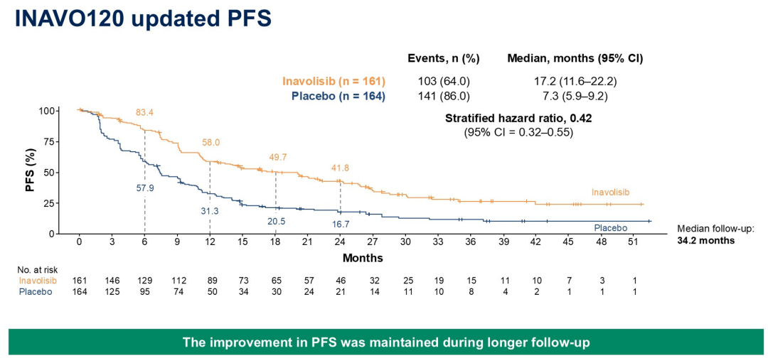 该研究入组了携带PIK3CA突变且既往辅助ET快速进展(辅助内分泌治疗中或完成后<12个月)的HR+/HER2-晚期乳腺癌患者。去年发表于NEJM的结果显示,在CDK4/6i+ET基础上联合伊那利塞,能够使PFS(15.5 vs 7.3个月;HR 0.43;P<0.0001)和ORR(58.4%vs 25.0%)都得到翻倍改善。这次ASCO大会报道更新的PFS依然保持显著获益(17.2 vs 7.3个月,HR 0.42),而且报道的OS结果显示伊那利塞达到了34个月,相较于对照组(27个月)具有显著统计学意义和临床意义的改善(HR 0.67,P=0.019)。