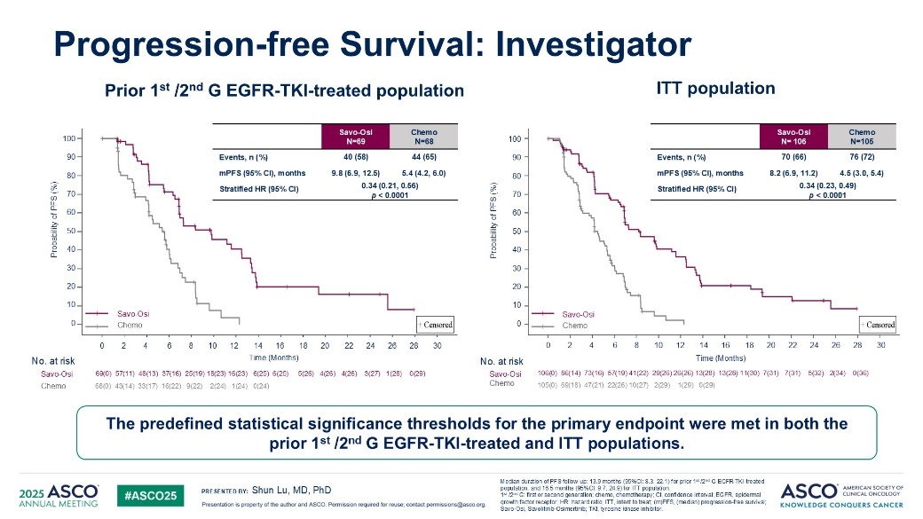 最终,双靶向组和化疗组分别入组106例和105例患者,基线分别有37%和39%的患者有脑转移,两组均有35%的患者接受三代靶向药物治疗,19del患者占比均为38%。在1/2代药物耐药所导致的MET基因异常的患者,两组中位PFS分别为9.8个月和5.4个月,HR=0.34,P<0.0001;在整体人群中,两组中位PFS分别为8.2个月和4.5个月,HR=0.34,P<0.0001,研究达到主要终点。接受三代药靶向药物耐药而导致MET异常的患者,两组中位PFS分别为6.9个月和3.0个月,HR=0.32,P<0.0001,基线有脑转移的患者,两组中位PFS分别为6.9个月和4.7个月,HR=0.40。基线无脑转移的患者,两组中位PFS分别为9.6个月和4.2个月,HR=0.30;ORR分别为58%和34%;DCR分别为89%和67%。两组中位OS分别为22.9个月和17.7个月,HR=0.84。