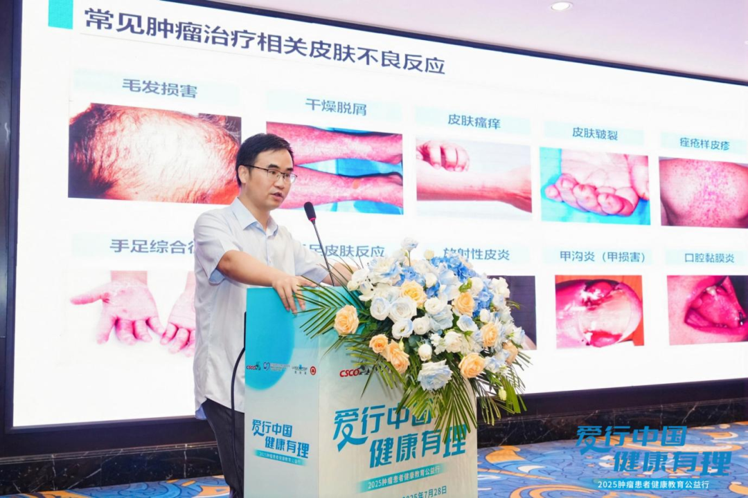 杭州市第三人民医院皮肤科叶瑜剑教授就“关爱皮肤,美丽同行——肿瘤治疗相关皮肤不良反应患者的自我管理”展开分享,结合在临床中常见的皮肤不良反应,如脱发、皮肤瘙痒、干燥、皮疹、手足综合征、甲沟炎、黏膜损害、放射性皮炎、重症多形红斑型药疹等不良反应,给患者分享了细致的自我管理建议,并强调了功效性护肤品的使用在预防和管理皮肤不良反应的重要性,让患者对皮肤护理有了全新且深入的认知。