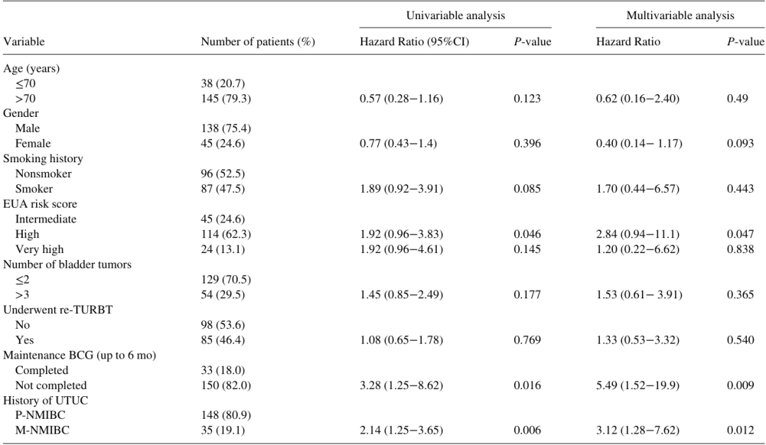 在183例确诊为HG NMIBC的患者中,有35例(19.1%)既往接受过UTUC治疗,并接受过根治性肾输尿管切除术(RNU),且切缘阴性。在异时性NMIBC亚组中,高危患者复发的中位时间为RNU后24个月。异时性NMIBC亚组包括25名男性和10名女性,平均年龄为75.0岁;而原发性NMIBC亚组包括113名男性和35名女性,平均年龄相似,均为77.02岁。