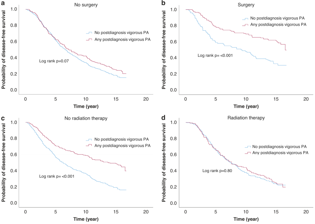 在接受手术的患者中,诊断后进行任何或无剧烈体力活动患者的无病生存率存在显著差异(57.9%vs 32.0%,P<0.001),但在未接受手术的患者中则无此差异(23.2%vs 17.1%,P=0.07)。在诊断后进行剧烈体力活动的患者中,诊断后无剧烈体力活动患者的无病生存率存在显著差异(46.2%vs 17.7%,P<0.001),但在接受放射治疗的参与者中则无此差异(23.0%vs 23.4%,P=0.80)。