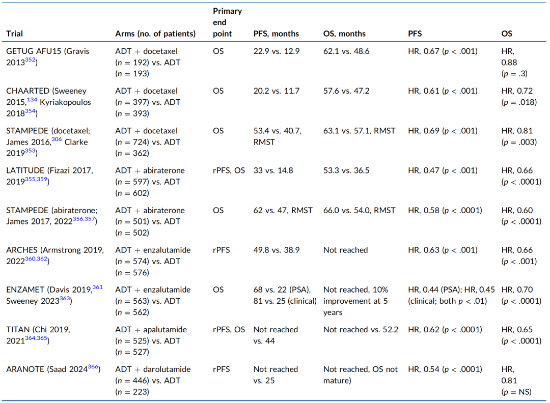 在mHSPC中,已有多项临床试验证明,ADT联合多西他赛或ARPI可显著改善总生存期。在高负荷同步转移患者中,多西他赛降低死亡风险的幅度最大。然而,这些Ⅲ期临床试验排除了体能状态差或合并症严重的患者,平均年龄小于真实世界情况。已知ARPI可能增加全因心血管事件,包括高血压、心律失常或心源性死亡。大多数Ⅲ期试验中的患者为新发转移性激素敏感性前列腺癌,在将这些数据外推至初始治疗后复发的患者时应谨慎。所有适合的患者都应接受ADT联合另一种药物的双药联合治疗;在条件允许的情况下,建议选择ARPI而非多西他赛。两项Ⅲ期试验证明,在ADT+多西他赛基础上加用ARPI可改善无转移生存期和总生存期,而ADT+ARPI+多西他赛的价值尚不明确。