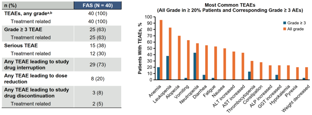 SG总体安全性可控、耐受性良好。全体患者≥3级治疗期间不良事件(TEAE)发生率为63%,较为常见的≥3级TEAE以中性粒细胞减少(43%)、白细胞减少(38%)、贫血(20%)等血液毒性为主,由治疗相关TEAE导致的停药率仅为5%(2例)。