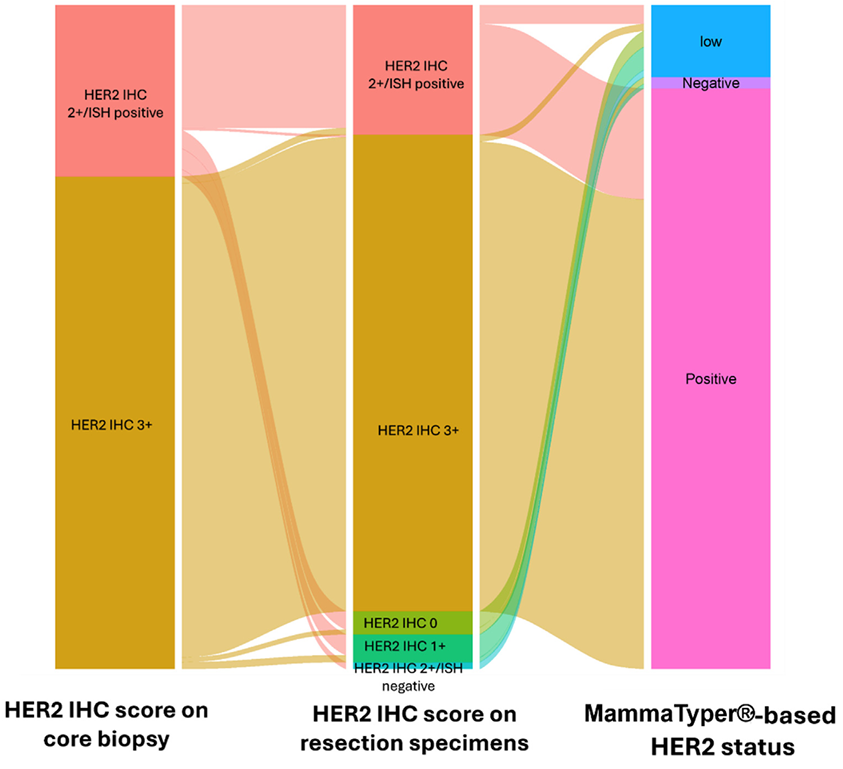 这项研究旨在评估基于mRNA的多基因检测在预测HER2+乳腺癌患者的抗HER2治疗的疗效作用,并对比了MammaTyper分类和传统IHC分类的差异。研究结果表明,MammaTyper检测可以客观且准确地评估HER2状态,对治疗结果具有重要意义。未来的研究需要进一步改进这些技术,并在更大、更多样化的队列中验证其临床实用性。