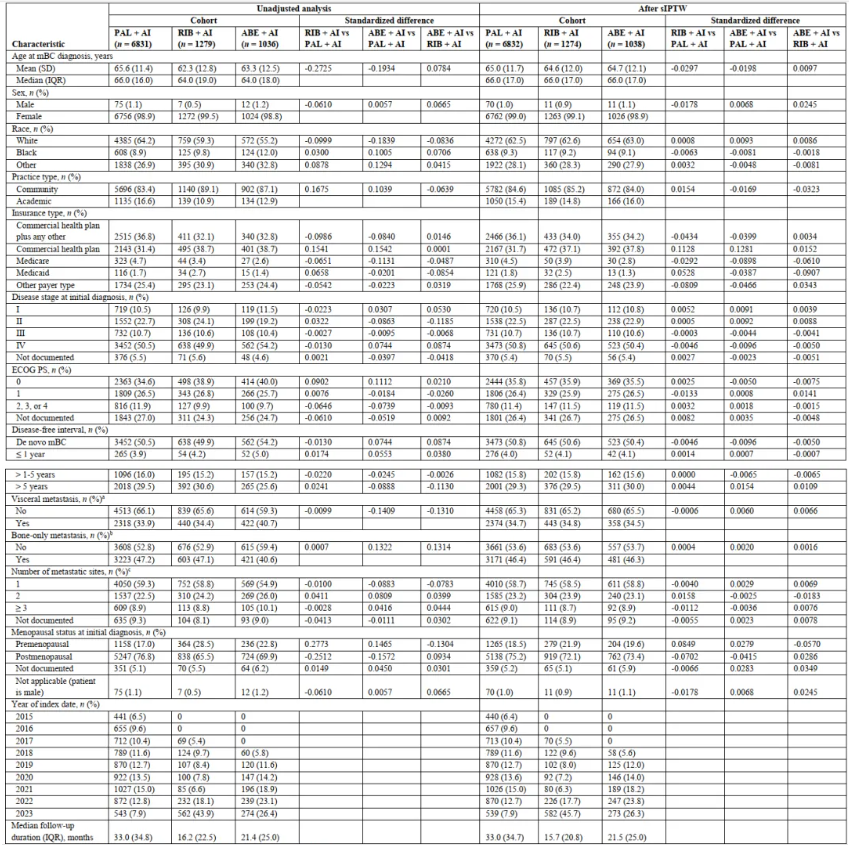 统计分析方面,采用描述性统计总结基线特征,Kaplan–Meier法估计rwPFS并绘图,主要分析基于Cox比例风险模型和稳定逆概率处理加权(sIPTW)计算HR及95%置信区间(CI)。其中加权通过多变量多项逻辑回归模型估计倾向评分,校正变量包括年龄、性别、种族、实践类型、ECOG评分、初诊分期、内脏转移、仅骨转移、转移部位数量和初诊至mBC的无病间期;这些变量同时纳入多变量Cox模型作为敏感性分析。