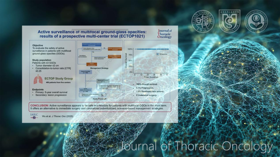 近日,国际肺癌研究领域权威期刊《Journal of Thoracic Oncology》在线发表了一项由复旦大学附属肿瘤医院胸外科陈海泉教授牵头、国内多家医疗中心共同参与的前瞻性多中心临床研究(ECTOP 1021)成果。这项全球首个针对174名多发磨玻璃肺结节患者的主动随访研究,首次公布患者生存数据。研究首次证实:对于特定类型的肺多发性GGO患者,在“外科治愈窗口期”内实施主动监测策略安全可靠,提出了“多发GGO的选择性根治术”,为即刻手术之外的个体化治疗提供了循证依据。